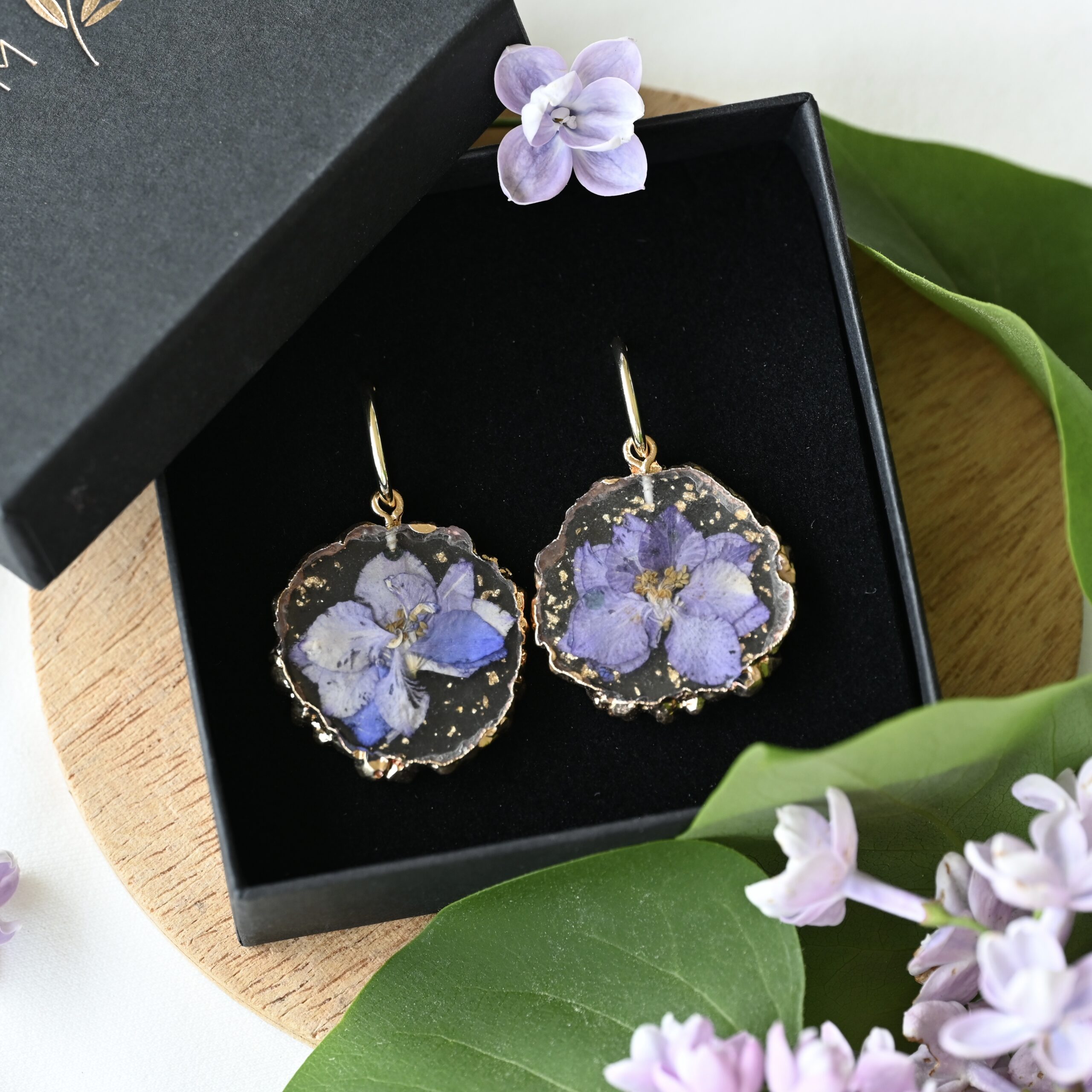 Real Delphinium Flower Resin Earrings with 14K Gold Plated Hoops