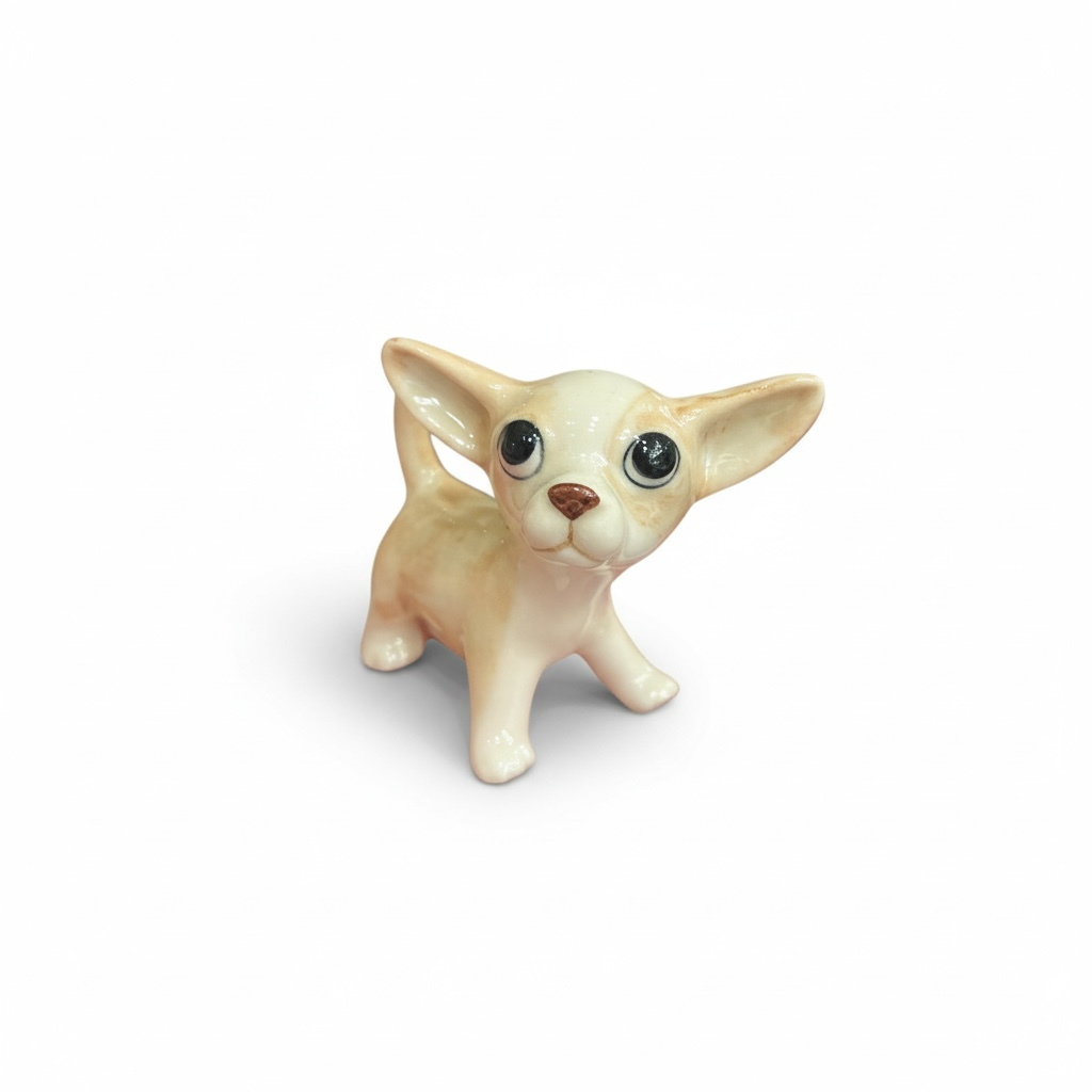 This ceramic light Chihuahua figurine is hand painted. It measures 5 cm and is a small decorative piece for any space.